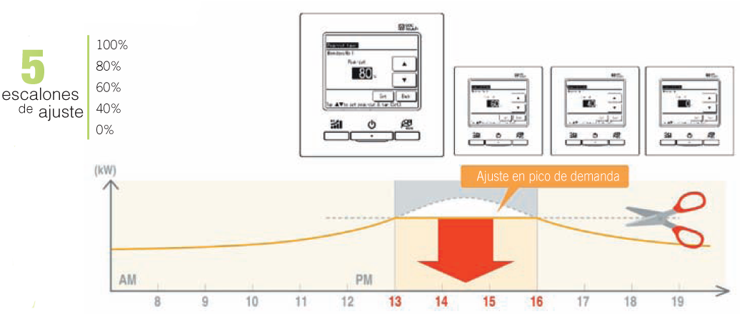 El control de capacidad se puede ajustar mediante el mando táctil RC-EX1A para un mayor ahorro de energía. Permite ajusta la capacidad durante los picos de demanda. Se puede elegir entre cinco escalones de ajuste (100-80-60-40-0%).
