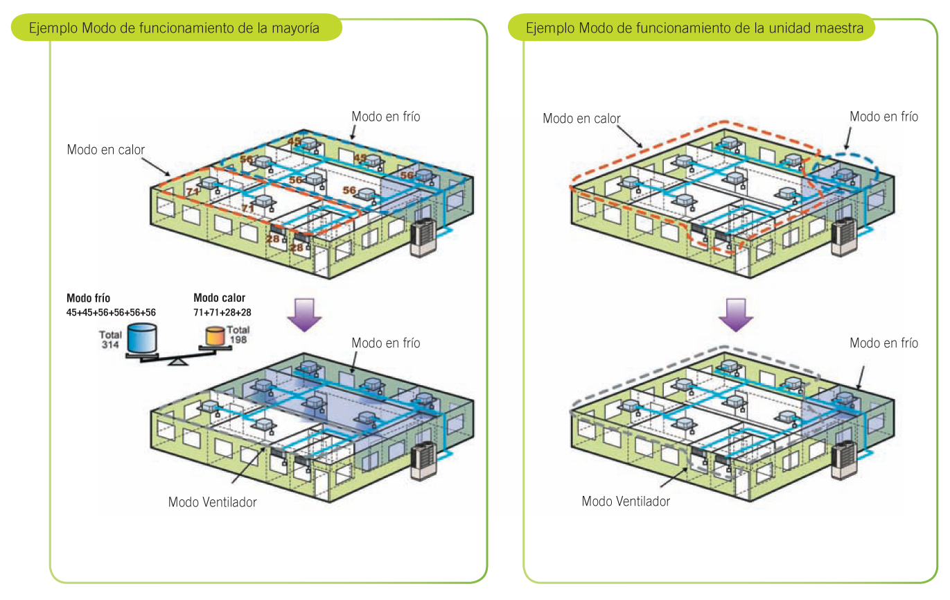 El sistema detecta la capacidad de unidades interiores funcionando en modo fío y en modo calor. La unidad exterior pasa a funcionar según el modo de la